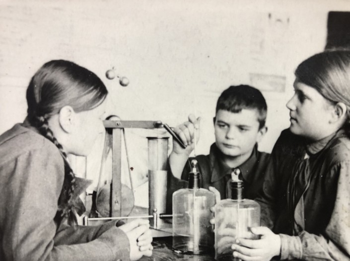 Пятиклассники алма-атинской школы № 8 на занятиях в кружке для юных физиков. 1939 год. Как и на предыдущем фото, школьники одеты в однотонную одежду. На девочке, что справа на фото, также верхняя рубашка с галстуком.