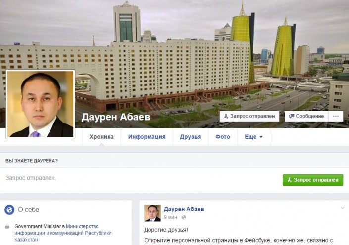 Министр информации и коммуникаций РК Даурен Абаев завел страницу в Facebook, передает корреспондент Tengrinews.kz.