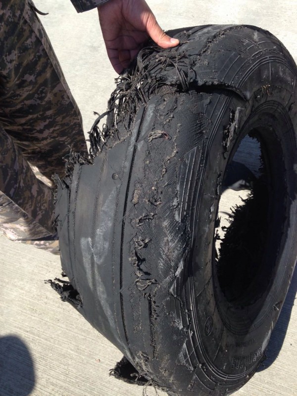 В пресс-службе Минобороны предоставили фотографии уцелевших и разорванных колес самолета. По словам представителя министерства, колеса были новые, практически без износа от производителя "Ярославский шинный завод".