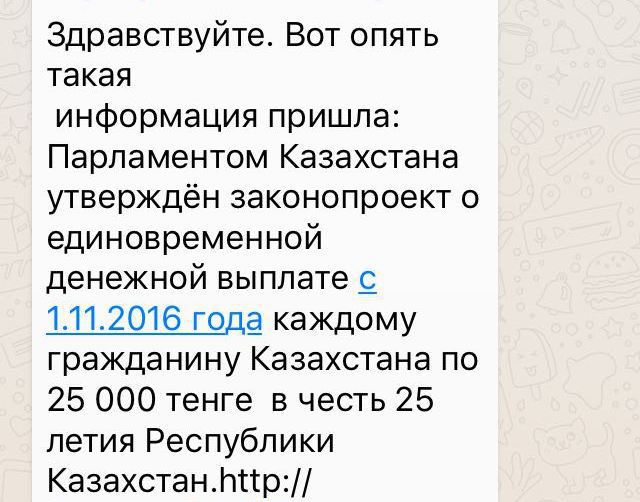 "Информация о том, что Парламентом РК утвержден законопроект о выплате с 1 ноября 2016 года каждому гражданину по 25 тысяч тенге в честь 25-летия независимости Республики Казахстан, распространяемая на некоторых веб-сайтах и интернет-порталах, а также посредством мессенджера WhatsApp, не соответствует действительности", - заявили в Министерстве.