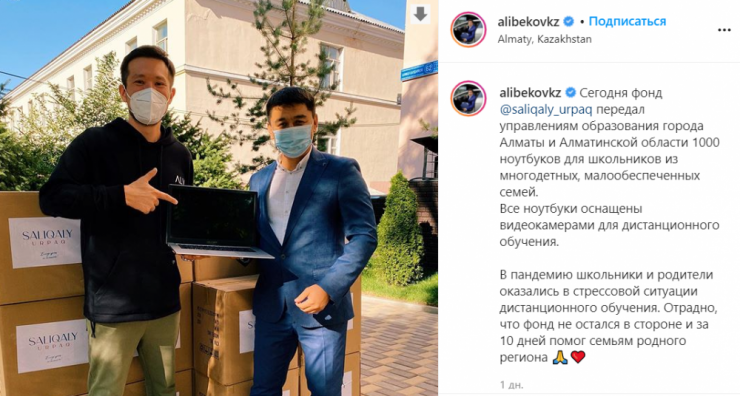 "Общественный фонд "Салиқалы ұрпақ" всегда готов помочь нуждающимся. В этом учебном году мы подарили 1000 ноутбуков в Алматы и Алматинской области в надежде, что дети из малообеспеченных семей не останутся вне программы и смогут без проблем учиться онлайн.