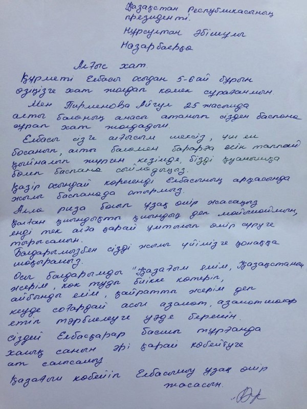 Письмо Айгуль Пирменовой опубликовано на официальной странице AkordaPress в Facebook.