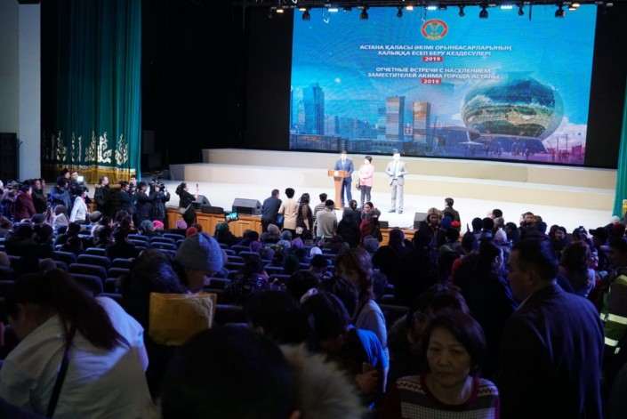 В концертном зале "Астана" (бывший Конгресс-холл) проходит встреча представителей акимата с многодетными родителями. Женщины просят сделать арендное жилье доступным, помочь улучшить их жилищные условия и увеличить пособия.