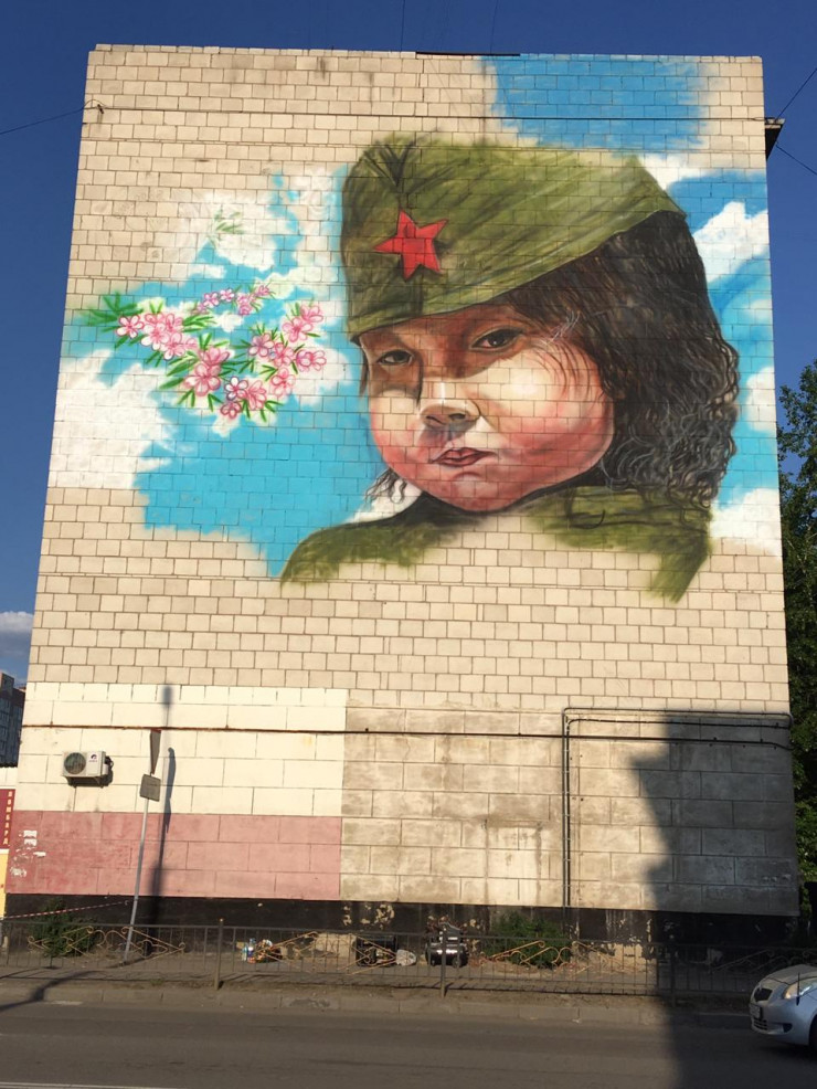 По его словам, авторы решили воссоздать портрет девочки, которую павлодарская художница Ольга Керимова сфотографировала на параде 9 мая в 2010 году.