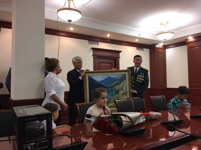 Министр поздравил семью альпиниста, надел на Максута Жумаева казахский чапан, его супруге подарил картину, а детям - игрушки и наручные часы, отметив, что младший сын Максута завтра отпразднует день рождения.