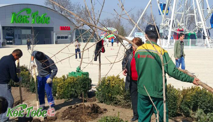 Отмечается, что бывший премьер-министр Казахстана Сергей Терещенко преподнес подарок - 200 саженцев алматинского апорта, которые были высажены в марте на южном склоне горы. Кроме того, в апреле работниками парка были посажены еще 1150 карагачей, в результате чего на северо-западном склоне горы будет целая полоса деревьев с раскидистой кроной. Тот факт, что на верхней площадке в настоящее время недостаточно зеленых насаждений, объясняется тем, что работы по благоустройству Коктобе еще не закончены. Общее количество посаженных деревьев - 3472, кустарников - 4294.
