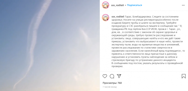 Пользователи соцсети Instagram обсуждают видеоролик, автор которого утверждает, что снятый в небе Тараза след от самолета - свидетельство распыления в воздухе химикатов, которыми "травят" людей. Эту информацию опровергли в акимате Жамбылской области, передает Tengrinews.kz со ссылкой на StopFake.kz.