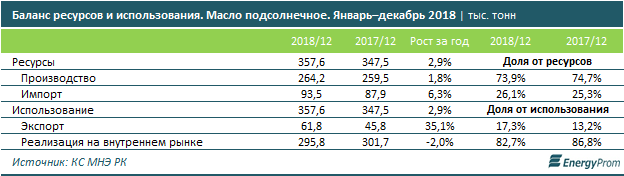Что касается реализации масла на внутреннем рынке, по итогам 2018 года объемы сократились на 2 процента. К марту 2019 года цены на подсолнечное масло в магазинах и на базарах Казахстана выросли на 8,1 процента за год, до 432,8 тенге за литр.