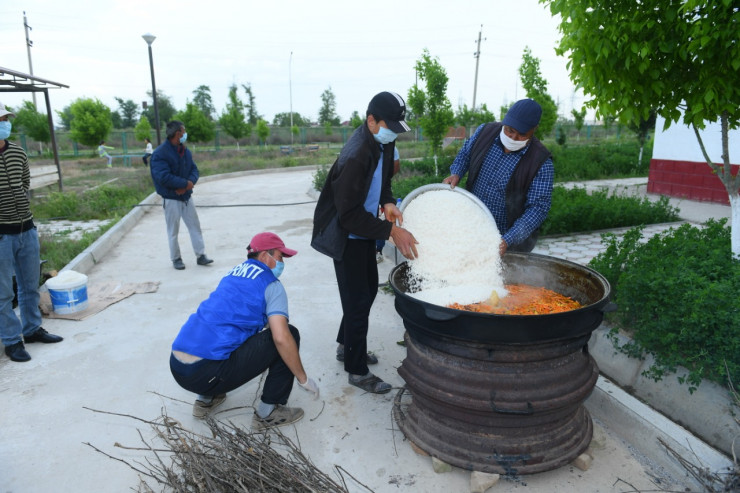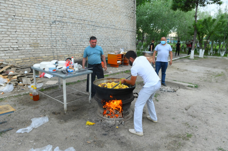 Такая же ситуация и в другой школе поселка Атакент. Кухню для приготовления пищи развернули прямо на улице. Варят пищу на открытом огне.