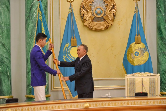 Знамя страны из рук Главы государства принял таэквондист Руслан Жапаров.