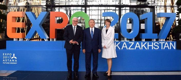 "Здесь лидеры двух стран ознакомились с интерактивными экспозициями, посвященными культуре и истории Казахстана, а также поднялись на восьмой этаж павильона, где расположена экспозиция "Астана будущего". По окончании экскурсии президент ФРГ сделал запись в книге почетных гостей выставки.