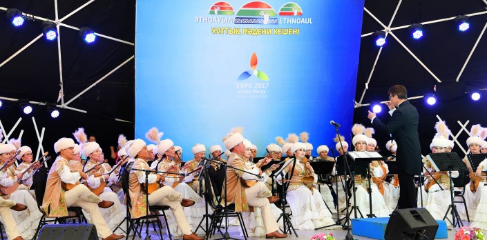 Главе государства были представлены экспозиции, которые знакомят гостей комплекса с национальной кухней, ремеслами, спортивными играми, традициями и обрядами казахского народа.