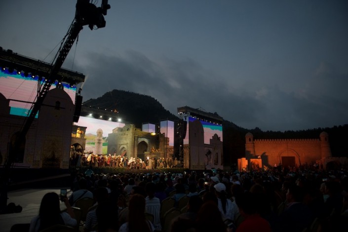 Вокалисты "Астана Опера" имеют большой опыт выступлений на площадках под открытым небом. Подобные проекты театр осуществляет уже на протяжении нескольких лет. Однако до этого все спектакли труппа исполняла в Астане, поэтому, чтобы отрепетировать мизансцены, привыкнуть к новым "живым декорациям", артисты прибыли на место заранее, и туристы с интересом наблюдали за ходом репетиций.