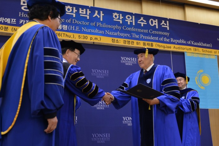 Отметим, что во время своего визита в 2010 году Нурсултан Назарбаев уже был удостоен звания почетного доктора Корейского университета. А на днях степень почетного доктора инженерных наук Президенту Казахстана присвоил еще и Японский университет Токай.
