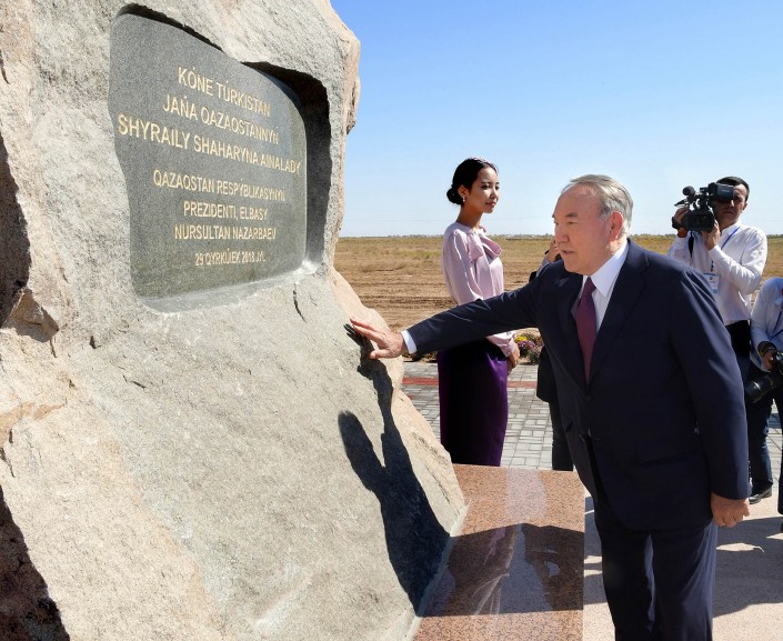 В ходе посещения территории нового административного центра Туркестана Глава государства принял участие в церемонии закладки мемориального камня.