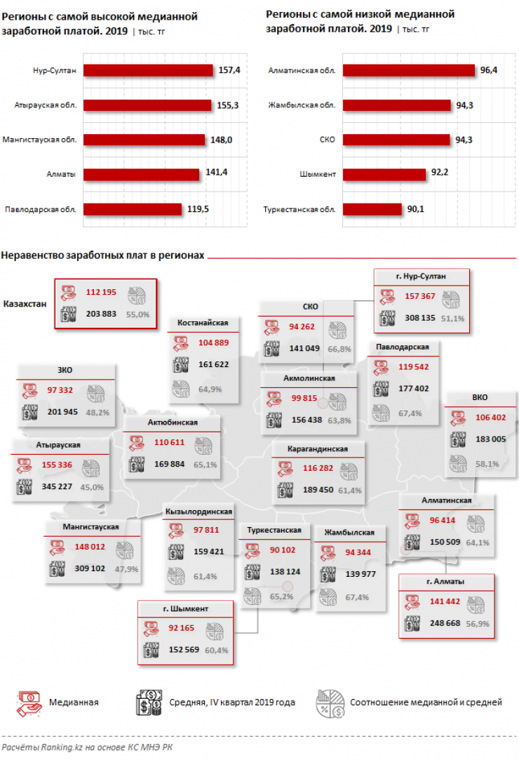 Разрыв между медианной и средней заработной платой составляет от 45 до 67,4 процента в зависимости от региона.