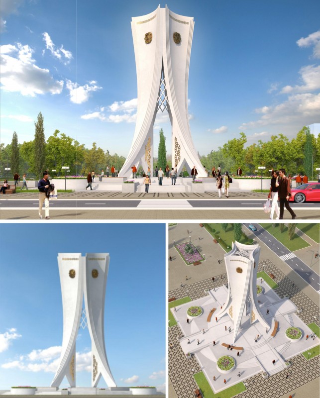 Монумент называется "Еркін Елдің Ертеңі" - "Будущее свободной страны". Проект выполнен в простой, лаконичной и динамичной форме. Высота монумента 25 метров - 25 лет Независимости Республики Казахстан. Расположен на стилобате квадратной формы по сторонам света. Имеет четыре равнозначных входа, четыре круглых цветника, четыре парные опоры - символы слогана: "Төрт құбылаң түгел болсын". В верхней части плавно изгибающие формы, превращающиеся силуэтом в восьмигранник - символ слогана "Сегіз қырлы бір сырлы".