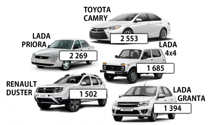 В рейтинге легковых моделей лидирует седан Toyota Camry (2 553 единиц). Три позиции первой пятерки бестселлеров заняли модели Lada: на второй строчке седан Lada Priora (2 269 единиц), на третьей расположился внедорожник Lada 4x4 (1 685 единиц). Четвертым по популярности автомобилем стал кроссовер Renault Duster (1 502 единицы). Замыкает TOP-5 января-октября Lada Granta с результатом 1 394 покупателя. Среди моделей, вошедших в первую десятку потребительских предпочтений, также Volkswagen Polo (1 360 единиц), Hyundai Accent (1 356 единиц), KIA Rio (1 088 единиц), Renault Sandero (1 080 единиц) и Toyota Land Cruiser Prado (1 028 единиц).