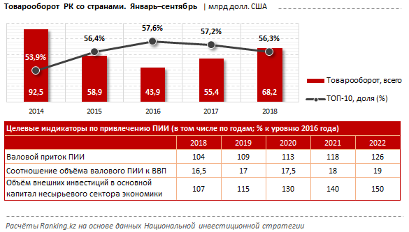 Внешняя торговля Казахстана с десяткой стран-инвесторов за 9 месяцев текущего года составила 38,4 миллиарда долларов, что равно 56,3 процента от совокупного товарооборота со всеми странами (68,2 миллиарда долларов). Россия - лидер в торговых отношениях с Казахстаном, с учетом инвестиционной активности страны. За январь-сентябрь страны обменялись товарами и услугами на сумму 12,8 миллиарда долларов. Следом идет Китай (8,2 миллиарда долларов), а замыкают тройку лидеров Нидерланды (5 миллиардов долларов).