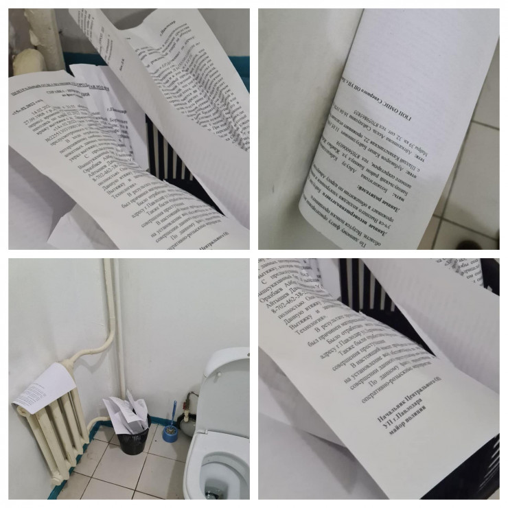 "Прошу Департамент полиции Павлодарской области и Министерство внутренних дел республики обеспечить туалетной бумагой данное УП, провести служебное расследование в отношении авторов данных документов и привлечь к дисциплинарной ответственности за разглашение данных досудебного расследования", - написала адвокат.