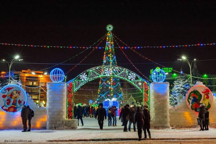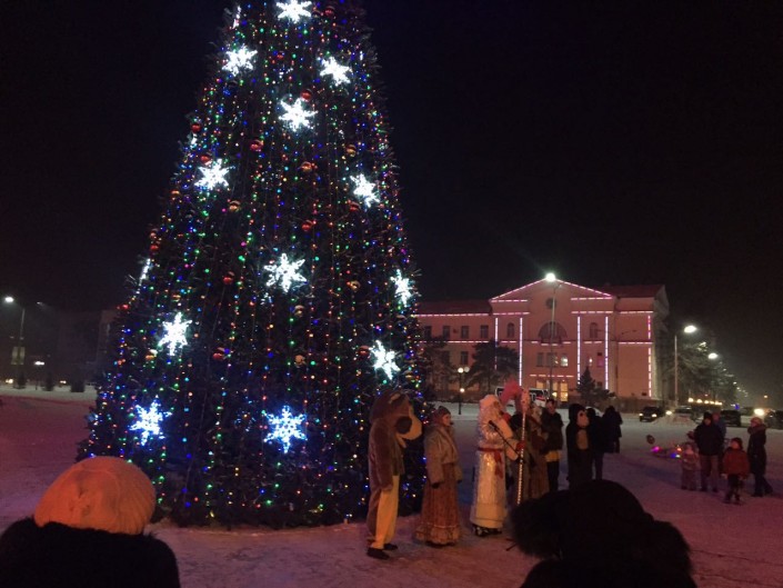 На центральной площади Петропавловска зажгли огни на 18-метровой елке. Она украшена игрушками и 60 светодиодными гирляндами. В церемонии принял участие аким Северо-Казахстанской области Ерик Султанов. Аким области вместе с детьми нажал на символическую кнопку, и чудо свершилось. Елка замигала разноцветными гирляндами. Все это сопровождали взрывы фейерверков и хлопушек с конфетти.