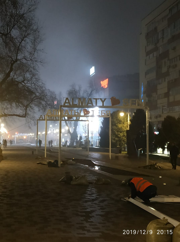 Композиции в виде арок появились по улице Жибек Жолы. Часть уже установили, часть устанавливают. На каждой имеется надпись "Алматы любит тебя" на трех языках - казахском, русском и английском. Пользователь Facebook Арнур Мамытбеков опубликовал фотографию строительных работ.