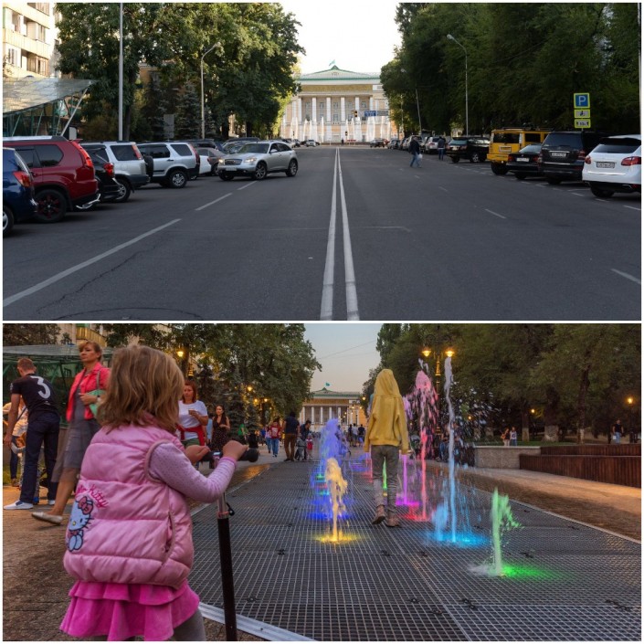При создании пешеходных пространств были построены семь фонтанов на улицах Панфилова, Жибек Жолы и площади "Астана".