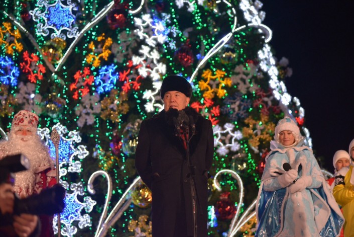 Нурсултан Назарбаев зажег главную новогоднюю елку в Астане, сообщает корреспондент Tengrinews.kz. Сегодня жители и гости казахстанской столицы отмечают двойной праздник. В День Первого Президента Глава государства зажег новогоднюю елку. Она установлена в столице в новом ледовом городке, который возвели китайские скульпторы и дизайнеры.