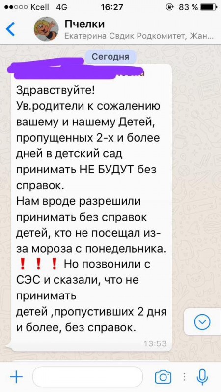 "Завтра понедельник, наконец-то морозы закончились, и мы поведем детей в садик. Всю неделю МЧС, акимат Астаны, премьер -министр рекомендовали воздержаться от походов на улицу детям и старикам, что мы неукоснительно исполняли. Кроме этого, детский сад мы ежедневно информировали о причинах нашего отсутствия, вызванных аномальными морозами. На сайте акимата была опубликована информация о том, что пропущенные дни не являются прогулом и не требуют справки. Сегодня, в воскресенье, 28 января, пришла рассылка от воспитателя, в которой четко указано требование предъявить справку за пропущенные дни", - написала родительница Светлана Тихомирова.