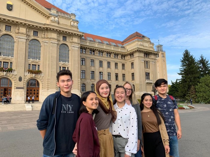 Студенты из Казахстана возле главного корпуса университета Дебрецена. Фото Александра Керимова.
