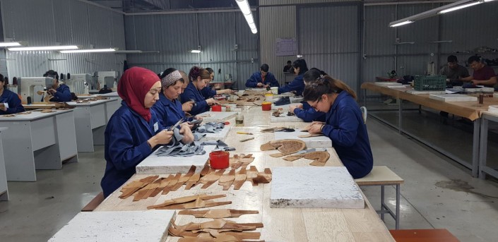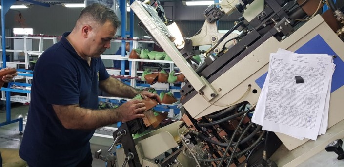 Затем все заготовки попадают в пошивочный цех. Здесь работницы вырезают так называемый подклад и стельку и собирают обувь по специальному образцу. Далее заготовки передаются швеям, которые аккуратно соединяют каждый шов.