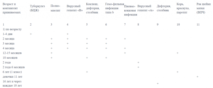 В перечень заболеваний, против которых проводятся обязательные профилактические прививки, вошли: вирусный гепатит А (В15), вирусный гепатит В (В16), гемофильная инфекция типа b (В96.3), дифтерия (А36), злокачественные новообразования шейки матки (С53), коклюш (А37), корь (В05), краснуха (В06), пневмококковая инфекция (В95.3), полиомиелит (А80), столбняк (А33-А35), туберкулез (А15-А19) и эпидемический паротит (В26).