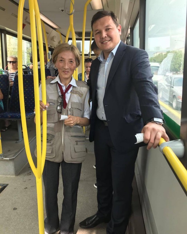 Эстафету от Ануара Жангозина, который ранее выложил селфи из автобуса, принял руководитель Управления по вопросам молодежной политики Асхат Оралов. На своей странице в Facebook он выложил совместную фотографию с кондуктором, сделанную внутри автобуса. По его словам, это был один из автобусов 25-го маршрута.