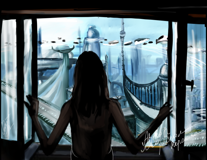 "В моем рисунке-проекте "Прекрасное далеко" изображена девушка, которая широко распахнула окно и смотрит вдаль, на свой любимый город. Если приглядеться, то можно увидеть образы будущего: летающие машины, парящие здания. Открытое окно представляет собой открытое счастью будущее. Работа выполнена в футуристических тоннах, потому что, голубой и синий цвет символизируют воздушность, безмятежность, спокойствие, цвет высоких технологий. В душе ощущается свобода, радость, покой, гармония, ясность. Все здания в будущем более стеклянные или зеркальные. Они лишь отражают небо и расширяют пространство и время", - рассказала Вероника Морская.