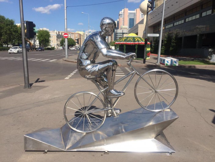 Хромированная фигура велосипедиста установлена по улице Кенесары у здания Министерства сельского хозяйства.