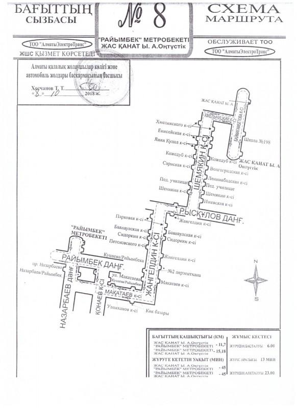 - маршрут № 8 "микрорайон Жас Канат - улица Хмельницкого - Шемякина - проспект Рыскулова - улица Жангельдина - Макатаева - проспект Райымбека - станция метро Райымбека в прямом и обратном направлениях";