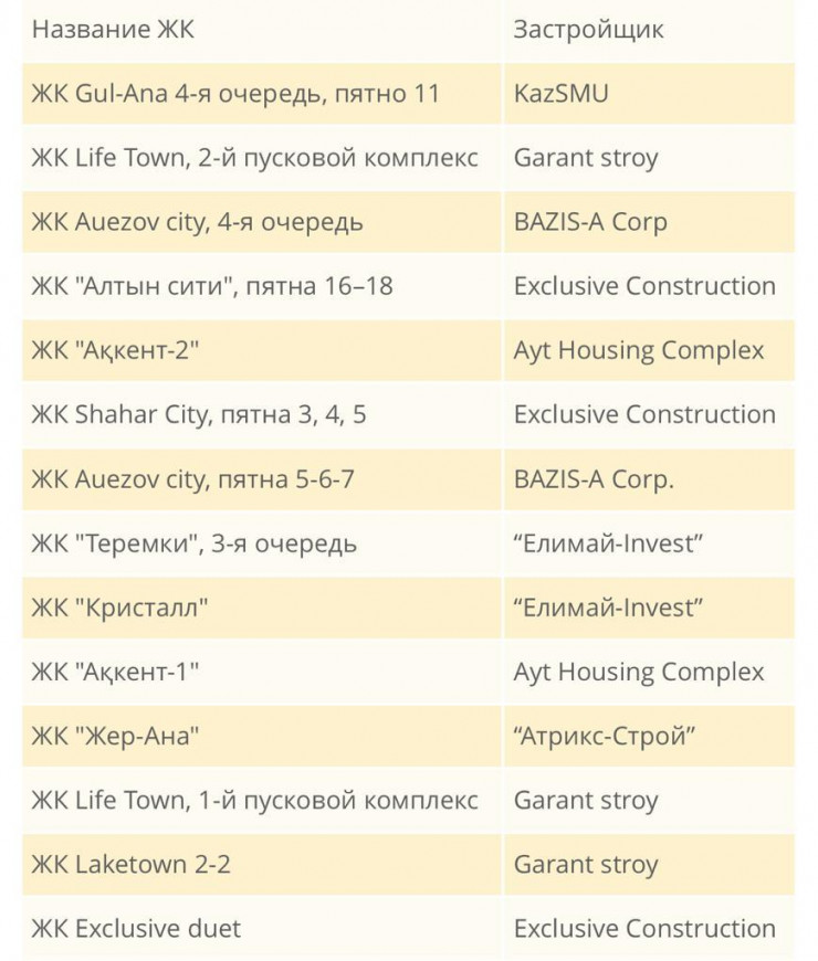При этом в Алматы строится более 130 жилых комплексов. На "Жилищном портале" можно узнать о строящихся ЖК по всему Казахстану. На данный момент имеется информация о 660 объектах (строящихся и уже сданных в эксплуатацию). Также есть данные о застройщиках, привлекающих средства дольщиков незаконно. Всего в списке 158 стройкомпаний или 167 ЖК. Большинство незаконных объектов выявлено в Астане - 117 ЖК.