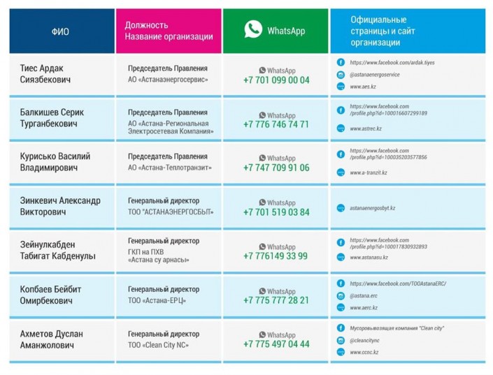 Опубликованы WhatsApp-номера первых руководителей обслуживающих компаний столицы, передает Tengrinews.kz.