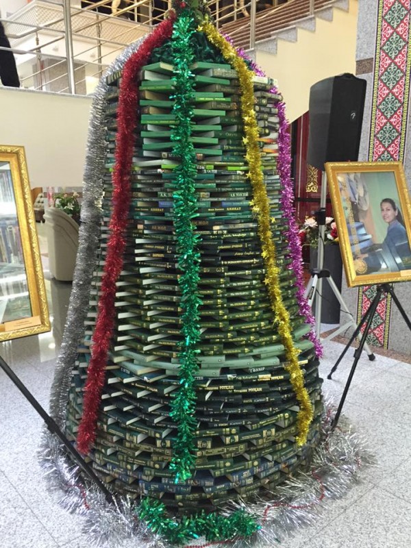 Необычную елку из книг установили в Астане, в Национальной академической библиотеке РК.