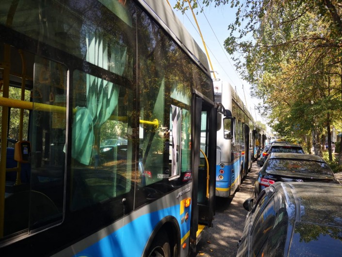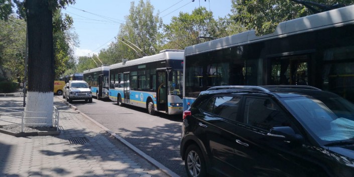 В Алматы в районе Зеленого базара встали из-за отключения тока 15 троллейбусов, передает корреспондент Tengrinews.kz.