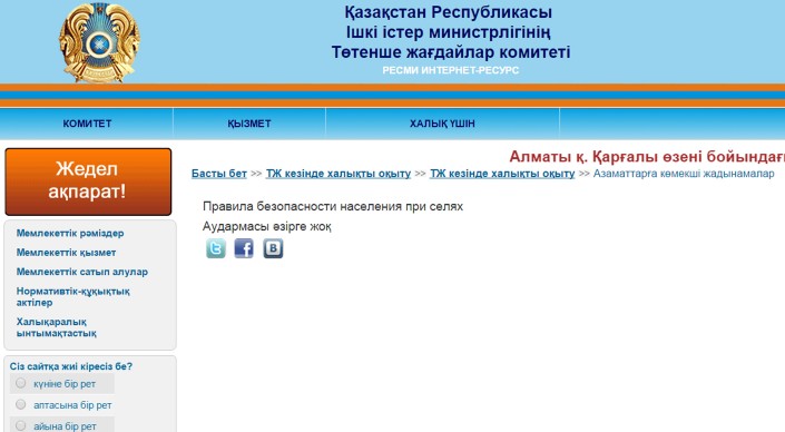 На сайте Комитета по чрезвычайным ситуациям есть памятка "Правила безопасности населения при селях" ("Сел қаупі жайында тұрғындарға ақпарат") на казахском языке. Однако, пройдя по указанной ссылке, на сайте появляется надпись "Пока нет перевода" ("Аудармасы әзірге жоқ"). Следом журналисты попытались найти информацию на сайте ДЧС Алматы. Там есть раздел "Жаднамалар халық үшін", название которого, как отмечает Massaget.kz, было переведено с русского слишком дословно и прямолинейно, с неверным порядком слов.