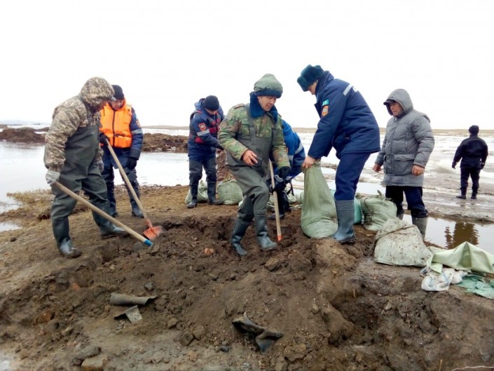 Силами и средствами подразделений ДЧС области и местных исполнительных органов проводятся работы по откачке воды из дворов и по укреплению вала вдоль реки Кызылкой путем укладки около 1500 штук мешкотары, протяженностью около 600 метров высотой 40 сантиметров, выполняется вручную дробление льда.