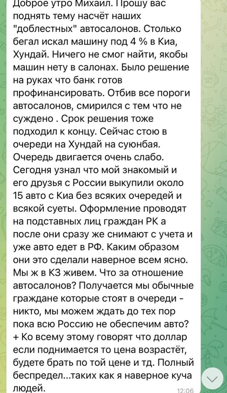 В Telegram-канале Kozachkov offside появилось сообщение от казахстанцев, которые не могут получить машины по льготным кредитам, якобы потому что новые автомобили перепродают в Россию по завышенным ценам.