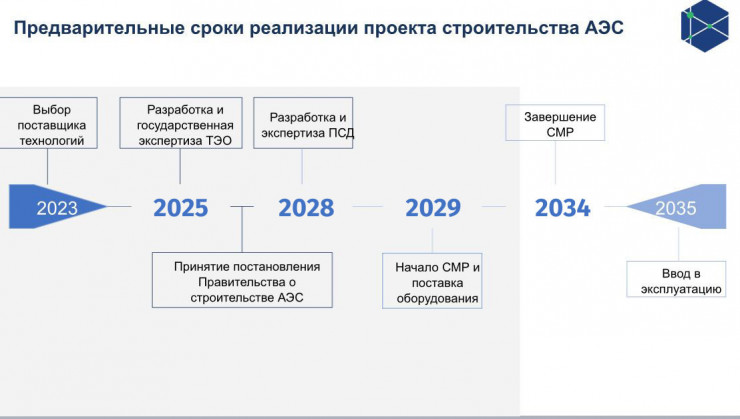 "Период подготовительных работ составляет примерно пять лет: это разработка ТЭО и ПСД. Основной период строительства АЭС составляет около шести лет. Итого срок реализации проекта, предположительно, составит 10-11 лет с даты принятия решения.