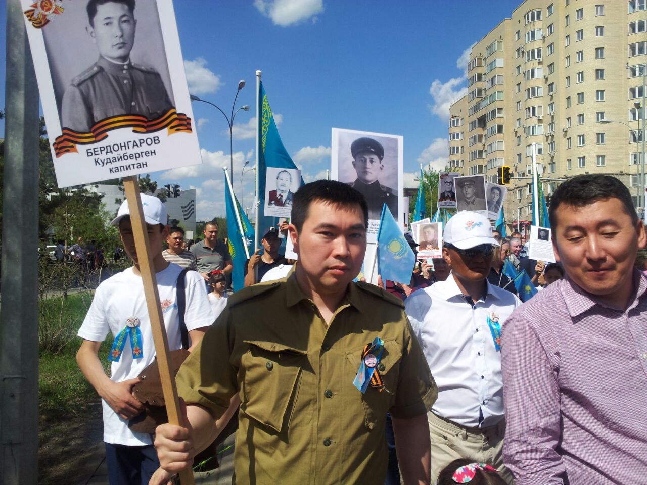 В шествии принял участие мажилисмен Танирберген Бердонгаров с фотографией своего деда - Кудайбергена, участника войны. "Он был капитаном армии - Кудайберген Бердонгаров. Я не мог пропустить это мероприятие, потому что когда портрет дедушки вместе с другими ветеранами движется колонной в атмосфере потомков, которые ценят и чтят память ушедших на этой войне - это возможность на секунду вернуть его, его дух сюда, на эту землю, которую он защищал" - сказал депутат.