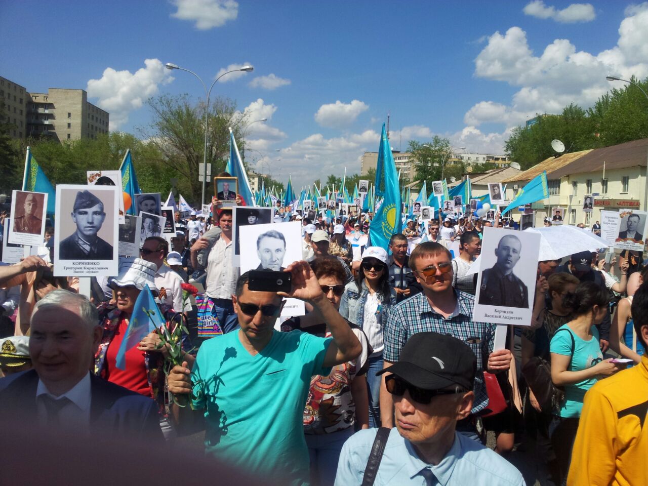 Как сообщил корреспондент Тengrinews.kz с места события, во время шествия его участниками таким образом была отдана дань памяти "Бессмертному полку".