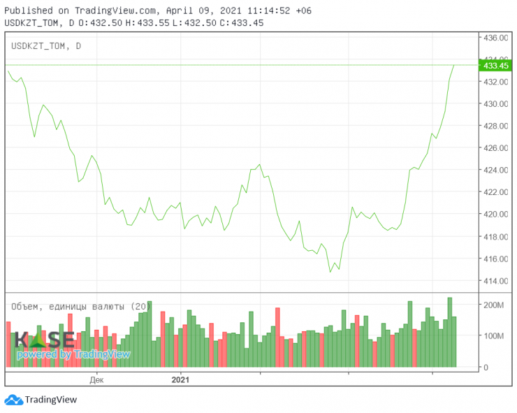 Напомним, тенге слабеет по отношению к доллару с 25 февраля, когда его стоимость была на уровне 415 за доллар. 8 апреля доллар закрыл торги на KASE на отметке 433 тенге, подорожав сразу на 2 тенге за сутки. В обменных пунктах Нур-Султана и Алматы максимальный курс продажи американской валюты составил 435 тенге. Утром 9 апреля курс доллара еще немного вырос.