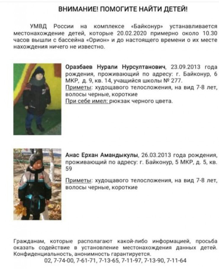 20 февраля два семилетних мальчика исчезли после тренировки, проходившей в спортивном комплексе "Маяк" в городе Байконур. Следственный комитет России завел уголовное дело по факту безвестного исчезновения двоих малолетних детей. Поисками детей занимаются российские и казахстанские правоохранительные органы.
