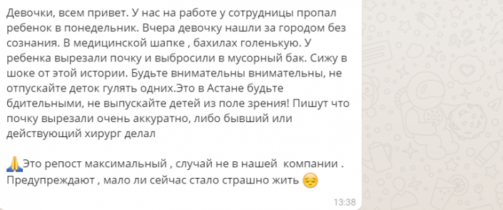 Среди пользователей мессенджера WhatsApp начала распространяться информация о девочке, которая якобы была найдена в Астане в бессознательном состоянии. Также в сообщении говорится, что ребенку вырезали почку.