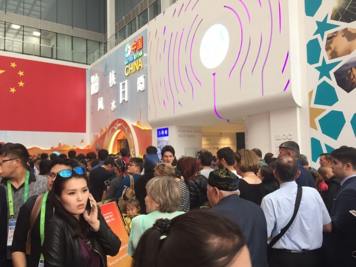 Но на территории выставки становится понятно, что ажиотаж наблюдается на входе практически во все павильоны, особенно в казахстанский павильон "Нур Алем".